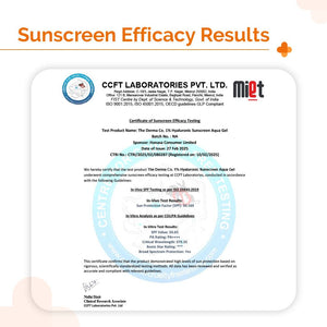 The Derma Co’s 1% Hyaluronic Sunscreen Aqua Gel has undergone IN-VIVO SPF Testing as per International Standards — ISO 24444:2019 and In-Vitro Analysis as per COLIPA Guidelines (Study Number: CTRI/2025/02/080287).