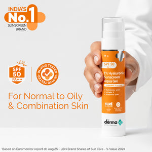 The Derma Co 1% Hyaluronic Sunscreen Aqua Gel is dermatologically tested and suitable for all skin types, providing hydration and broad-spectrum SPF 50 protection. It is also Invitro and In-Vivo Tested (as per ISO 24444:2019 standards).