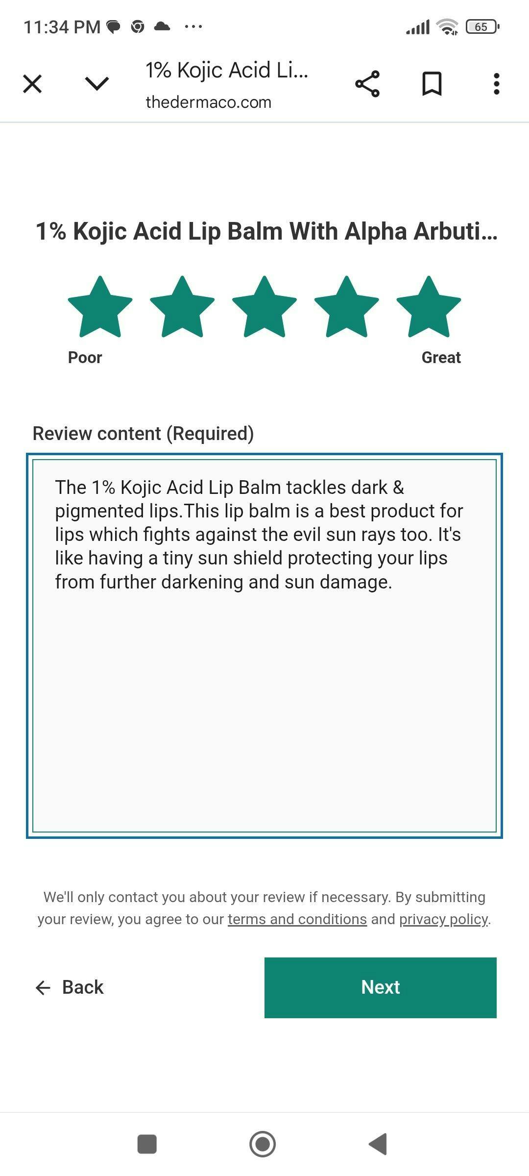 Kojic acid helps treat dark and pigmented lips. It may inhibit tyrosinase activity, thus preventing the appearance of hyperpigmentation and uneven texture. If you're looking for a safe and effective Kojic Acid-enriched lip balm, we recommend The Derma Co 1% Kojic Acid Lip Balm with Alpha Arbutin and Hyaluronic Acid. It hydrates and heals chapped or pigmented lips, giving them a soft and supple look. With its SPF 30 formulation, it also protects them against harsh UV rays. Designed by dermatologists, it can be used twice daily for best results.