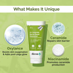 The Derma Co 4% Ceramide Barrier Repair Moisturizer has Ceramide, Niacinamide, and Oxylance. It deeply moisturizes the skin, fortifies its protective barrier, and makes it resilient to environmental stressors. Ceramide helps boost collagen and improves skin's hydration levels, helping combat fine lines and wrinkles. This Oxylance skin barrier repairs moisturizer, oxygenates & invigorates your skin, giving you that post-yoga glow. It is an all-round skin moisturizer that hydrates, nourishes and repairs skin with its unique formulation. Designed by dermatologists, it is safe and effective to use on all skin types.