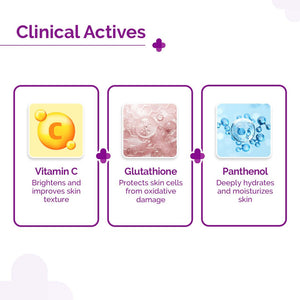 Glutathione protects against oxidative stress, Panthenol soothes & repairs, and Hyaluronic Acid hydrates and plumps the skin for a revitalized look.