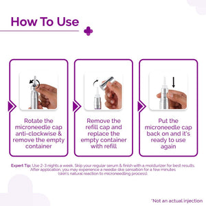 Replace your empty microneedle container with the refill or apply directly after cleansing. Follow with moisturizer and sunscreen for best results.