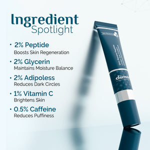 This advanced formula boosts collagen production and improves skin elasticity. Targeted 2% Peptide Complex accelerates skin regeneration for visibly renewed under eye skin, while moisture-balancing 2% Glycerin maintains optimal skin hydration. To visibly fade dark circles, 2% Adipoless targets pigmentation at its source, while 1% Vitamin C brightens the skin. Finally, 0.5% Caffeine stimulates healthy circulation, leaving the area depuffed, and of course, more awake!